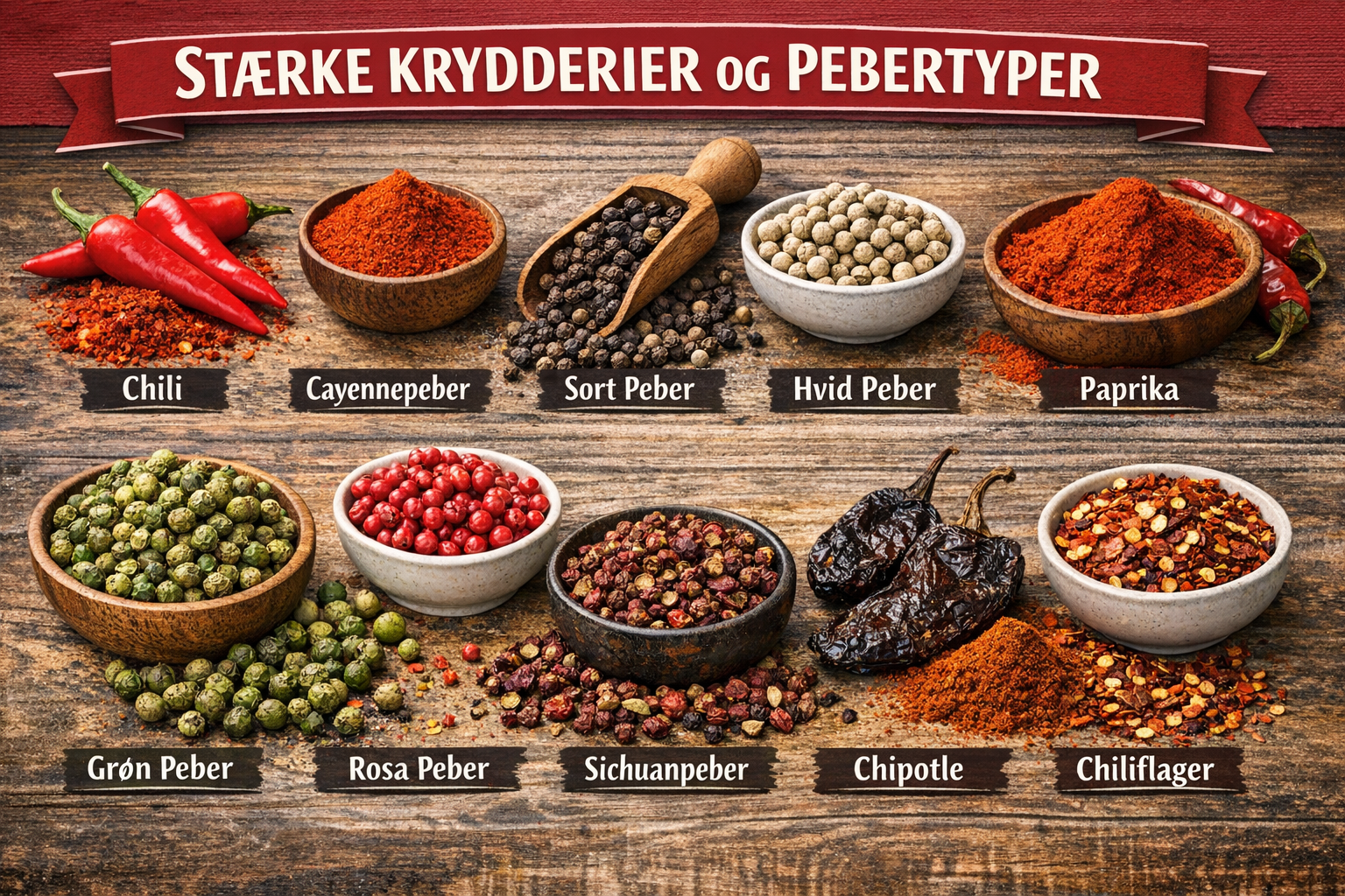 Røget paprika (pimentón) – giver en markant røget smag, især brugt i spansk og mexicansk mad.